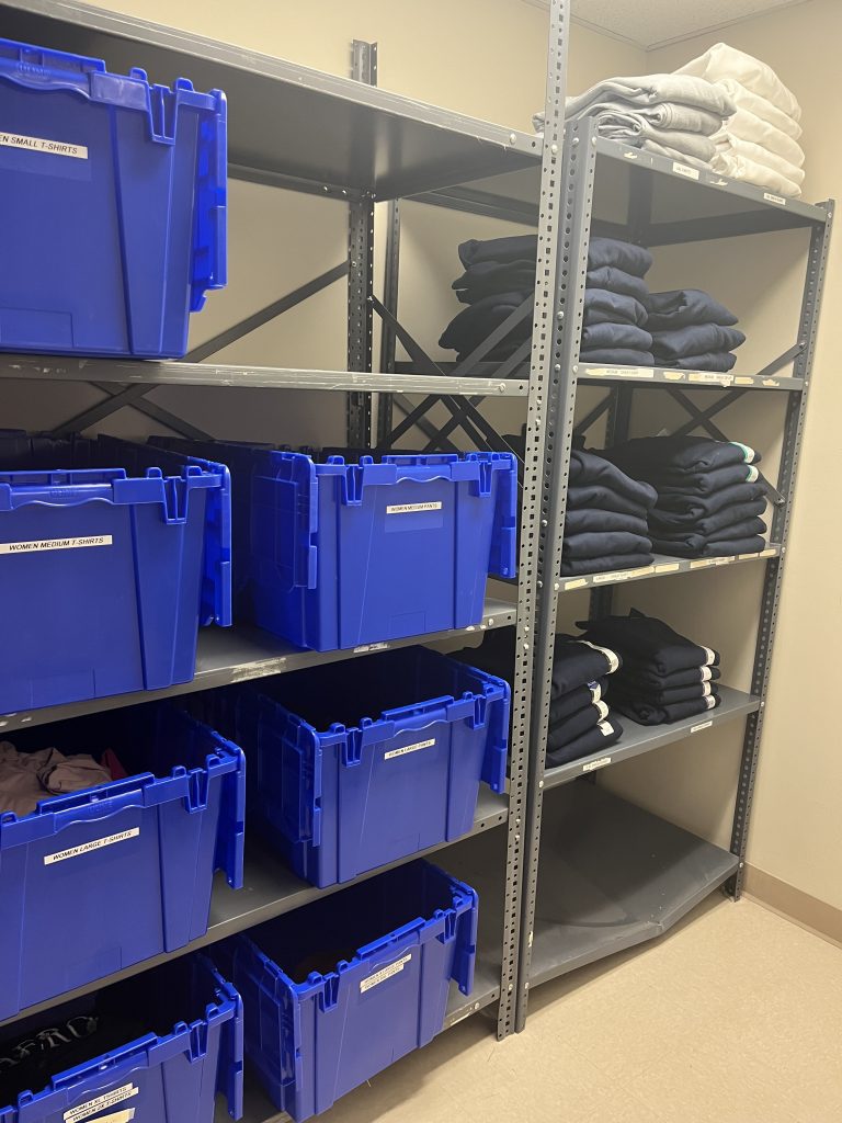 Thanks to the Mission department and the support of Dr. Jones, the Auxiliary, Stewpot, LDI and Our House, the Infirmary officially has a clothing closet!