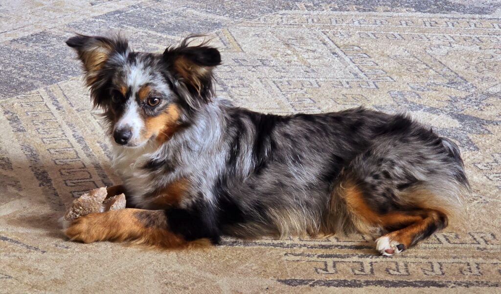 Crystal says she had wanted a blue merle Aussie for a long time and found Finlee when she was only eight weeks old. She drove for an hour through hail and a tornado warning to pick her up! Finlee is now two years old and loves perching on Crystal’s shoulders for a road trip or greeting her with a dance and song (“scream”) when she gets home. Finlee is a small dog, but Crystal says she feels like the biggest dog there is.