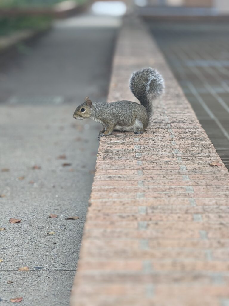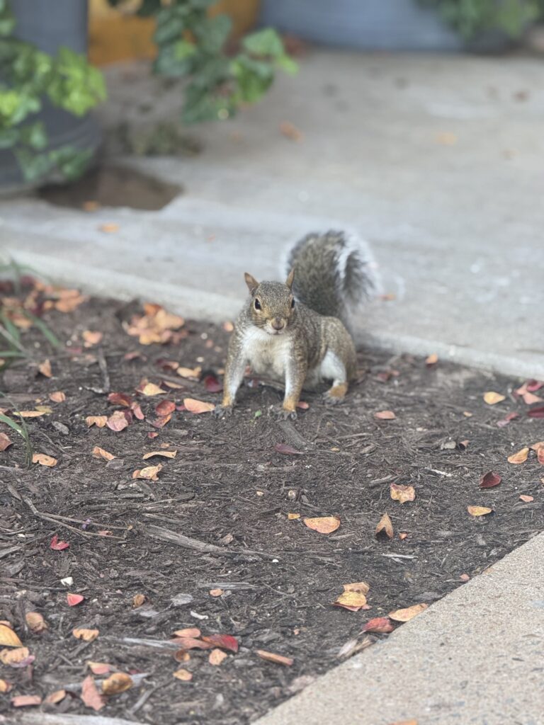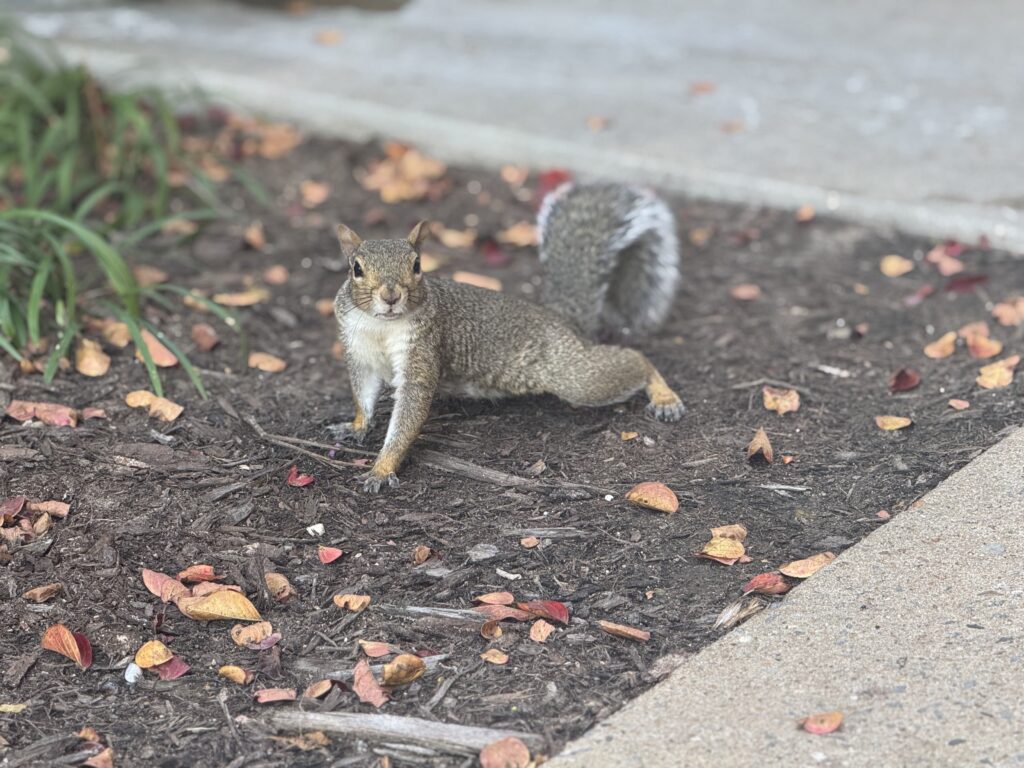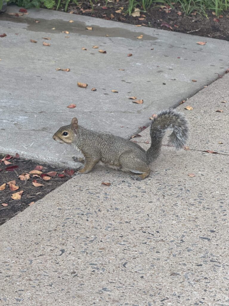 If you’ve ever come in the Infirmary rear entrance, chances are you’ve met Fuzzynuts. This adorable eastern gray squirrel has made a career out of scavenging and begging for food from willing coworkers. Typically, Fuzzy is quick to snatch up any scraps that happen to fall his way, though he’s not above doing some begging/trick-or-treating to get the marketing folks to cough up a few peanuts. Fuzzynuts has become one of the team at the Infirmary, and we wish him a very warm and satisfying rest during the upcoming cold months.